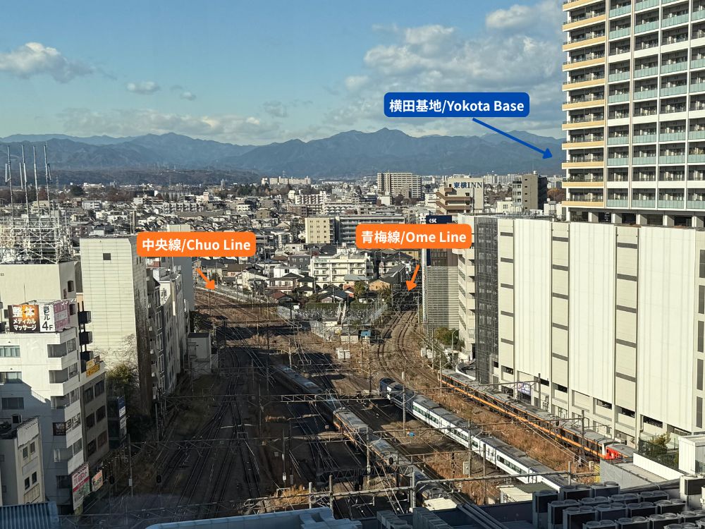 If you look toward the Ome Line tracks in the distance (on the far right), you might catch a glimpse of airplanes in the sky, thanks to Yokota Air Base located in Fussa City.