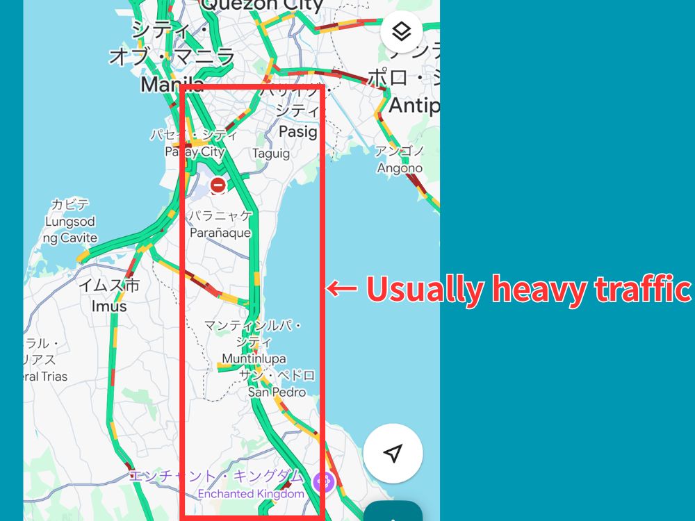 フィリピンは国民の9割がクリスチャン。マニラへ向かう高速はいつも渋滞。土曜日も一日混んでいます。日曜日は午前中教会に行く関係で空いてますが夕方から大渋滞でした。普段1時間かかる道が+30分程度かかるイメージでした。