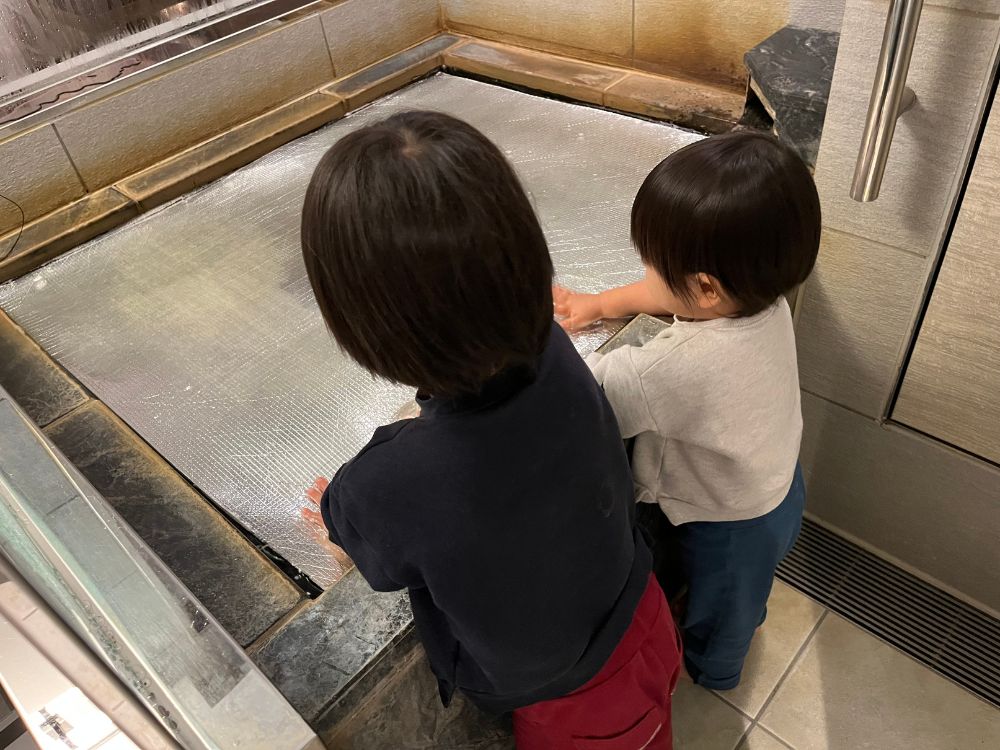 こちらも入りたかったのですが、実は次男が2日前に転んで足をひねり、湯船は控えるよう言われていました。思ったよりも良くなってはいたので、少しだけ一緒に入ることにして、大浴場は諦めることにしました。