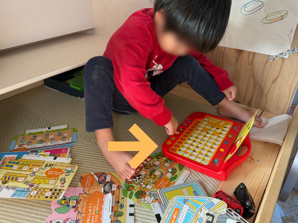 次男は器用で力も強いので押すことができていましたが、長男はボタンを押すことに苦労していました。ど真ん中をそこそこな力で押さなければならないので、他のタブレットおもちゃと比較して、年齢が幼い子が利用するには使いにくいと思いました。