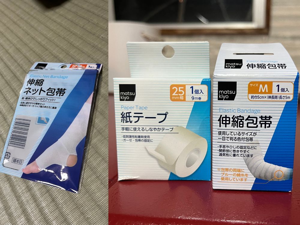 明日までそのままにしても大丈夫だとは思いつつ、痛いことを忘れてたくさん歩いたり、長男がうっかり患部を踏んだりするのが怖かったので、ドラッグストアで包帯などを購入することに。