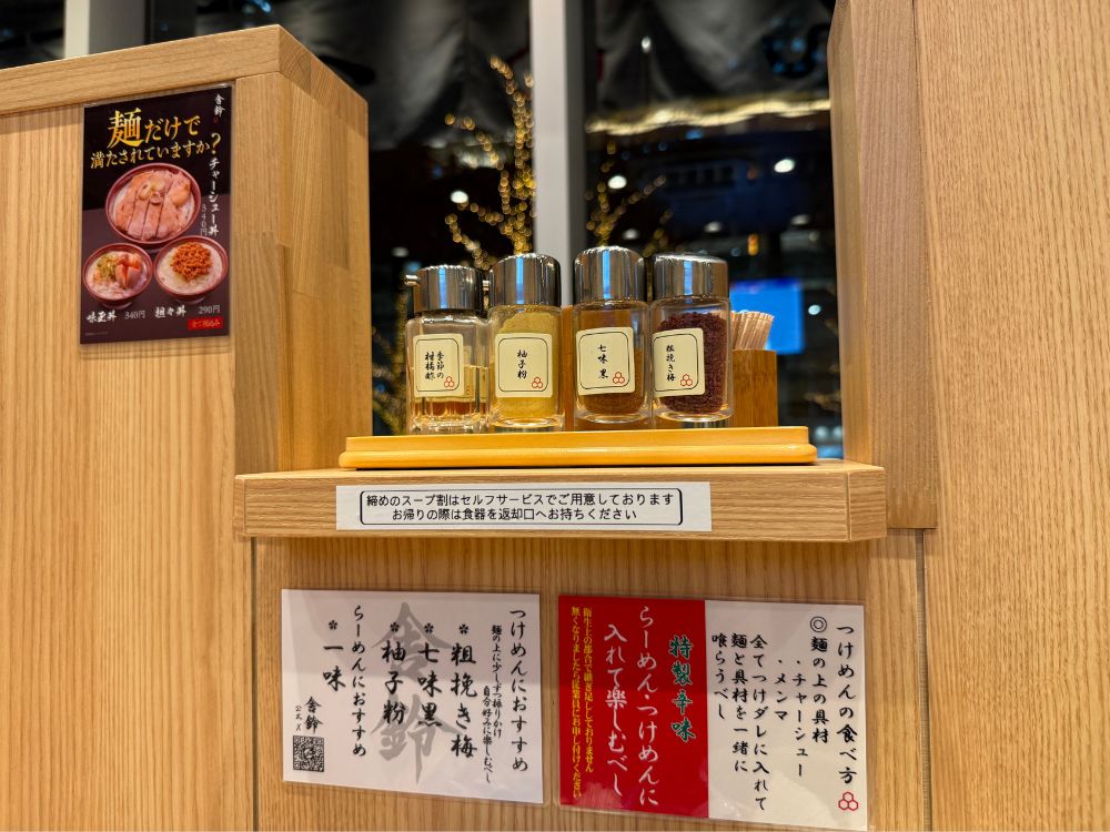 味変ができ、個人的にはお酢とゆずパウダーが美味しかったです。辛いものが好きな方には辛味噌と七味、一味がありました。